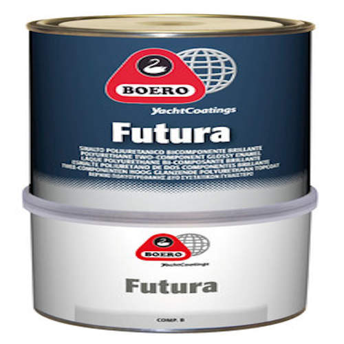 Futura is a polyurethane topcoat which stands out for its excellent resistance to ultraviolet rays ad marine weathering. Moreover, it is worth mentioning its brightness and its resistance to abrasion and washing. It boasts a good brushability. Available colors: 001 White 046 Cloud Grey 018 Matterhorn 035 Oyster White 062 Grey 160 Yellow 180 Red 072 Green 120 Light Blue 401 Ocean Blue 116 Dark Blue 201 Black